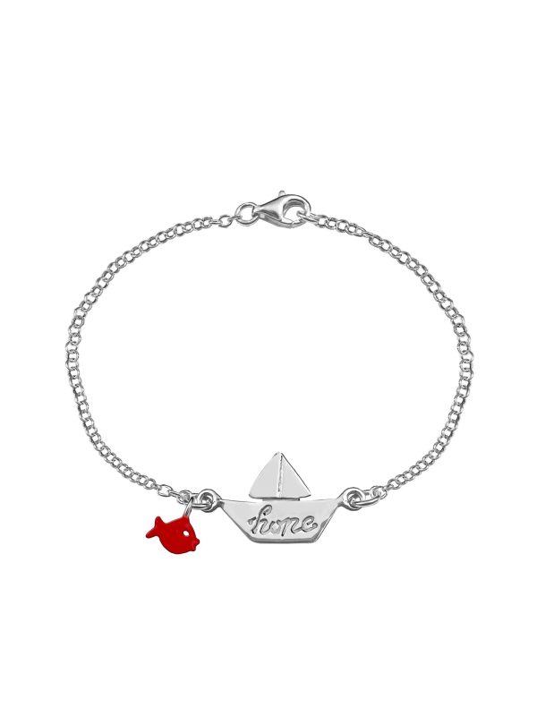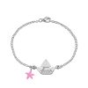 Bracciale in Argento 925 con barchetta e scritta Hope traforata a mano. Disponibile con due varianti di charm abbinato: stella marina rosa oppure pesciolino rosso