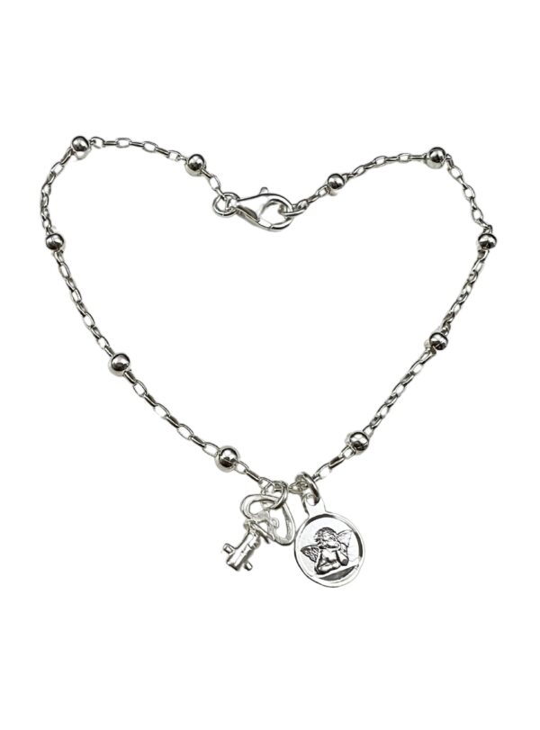 Bracciale a Rosario in Argento 925 con ciondolo chiavetta in Argento 925 e campanellino Chiama Angeli. Lunghezza bracciale standard 18 cm.