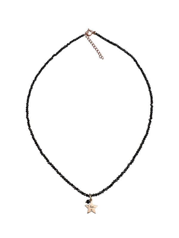 Collana Girocollo in Cristalli neri sfaccettati e Argento Rosato, con charm Stellina Hope in Argento Rosato con elemento pietra in Onice e anellino in Argento Rosato.